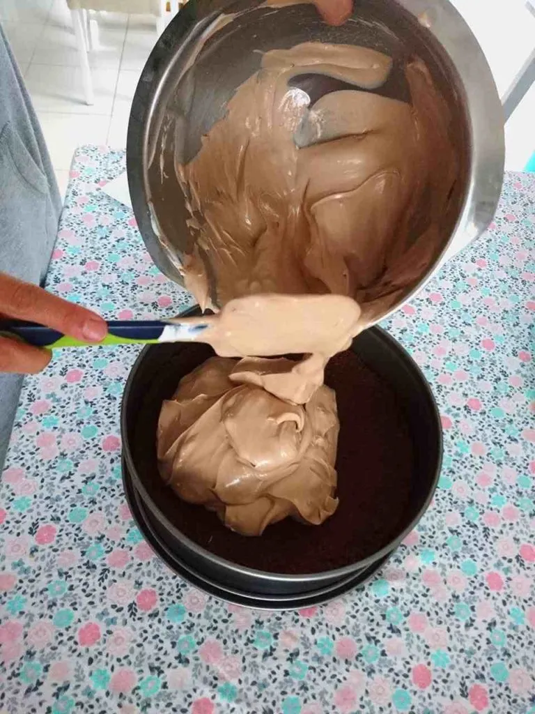 Medzitým si začneme pripravovať krém. Začnete s tým, že si vo vodnom kúpeli rozpustíme čokoládu. Pridáme 70 ml smotany na šľahanie, ktorú zohrejeme a následne do nej pridáme 100 g mliečnej a 50 g horkej čokolády. Poriadne premiešame a necháme 5 minút chladnúť.