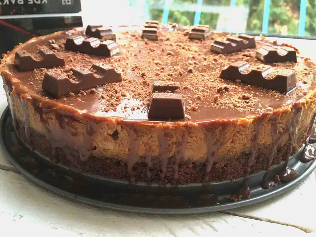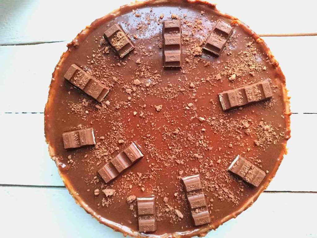 Hotový cheesecake dáme stuhnúť na 2 hodiny do chladničky a potom dorobíme čokoládovú polevu. Pripravíme ju tak, že si roztopíme 100 g mliečnej čokolády vo zvyšnej smotane a polejeme ňou hotový čokoládový cheesecake.