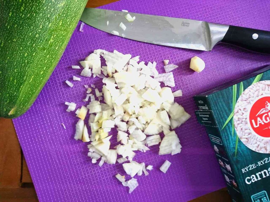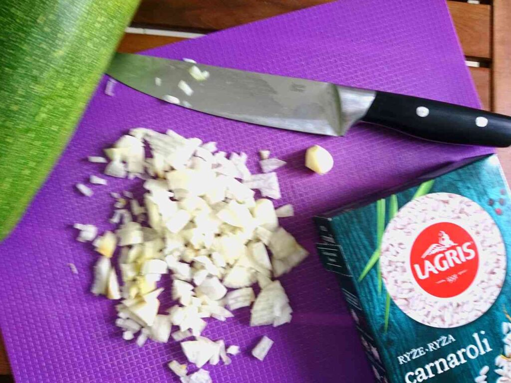 Medzitým si umyjeme cuketu, odrežeme konce a nastrúhame si ju nadrobno. My sme mali domácu cuketu, takže sme ju nezbavovali šupky. Krásna zelená šupka na záver dodá rizoto aj sviežu farbu.