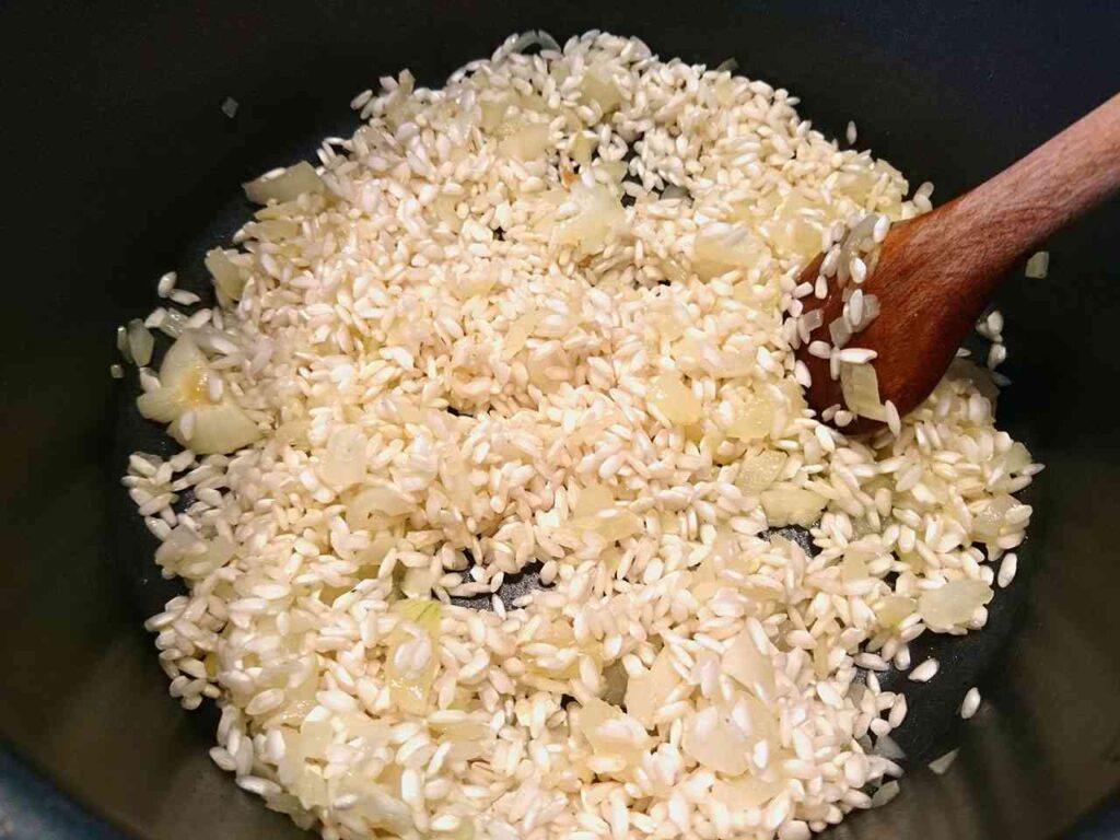 Rozohrejeme si hrniec, avšak opatrne, aby sme nemali príliš vysokú teplotu. Pridáme olivový olej a po minútke aj nadrobno nakrájanú cibuľku. Chvíľku restujeme, ale pozor na to, aby ostala cibuľka bez farby, nakoľko sfarbená má úplne inú chuť a rizoto by pripomínalo skôr chuť guľášu. A to predsa nechceme! K cibuľke pridáme aj nadrobno nakrájaný cesnak.
