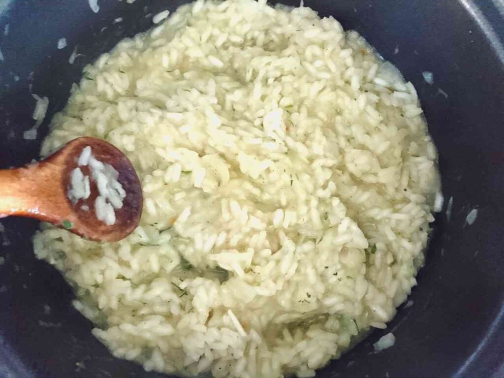 Rizoto podlejeme suchým bielym vínom, ktoré necháme dobre vyvariť. V tomto bode môžeme ryžu aj osoliť a okoreniť. Ryžu postupne podlievame kvalitným vývarom, po malých dávkach… tak dlho, kým nebude mať ryža správnu konzistenciu.