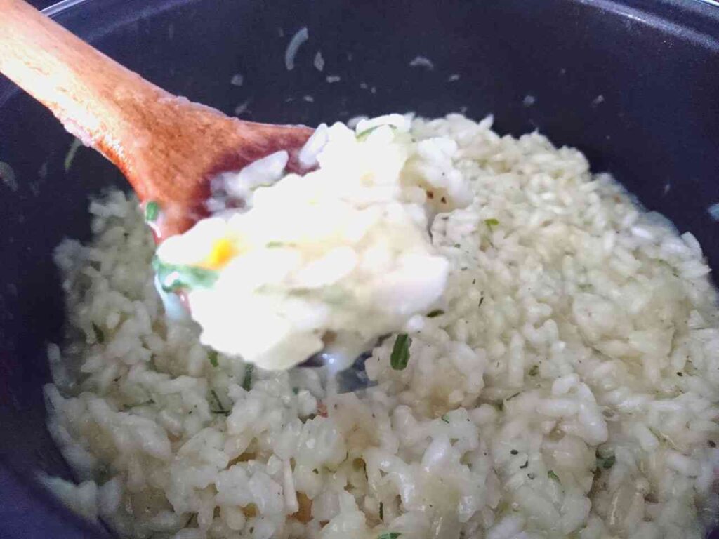 Na záver pridáme do cuketového rizota plátok masla a počkáme, kým sa nám neroztopí. Rizoto tak krásne zhustne a získa presne takú konzistenciu, ako máme najradšej. Pridáme ešte najemno nastrúhaný parmezán a jemne premiešame. Môžeme podávať.