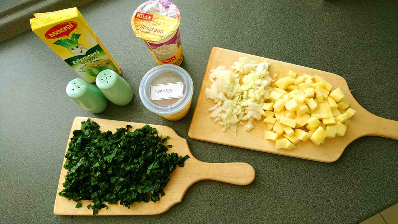 - Najskôr si pripravíme potrebné ingrediencie. Cibuľu pokrájame nadrobno, jarné cibuľky umyjeme a pokrájame na kolieska. Zemiak ošúpeme, umyjeme a pokrájame na malé kocky. Medvedí cesnak umyjeme pod tečúcou vodou, odstránime z neho stopky a necháme na sitku vysušiť. Na polievku z medvedieho cesnaku by sme ho mali pokrájať na menšie časti.