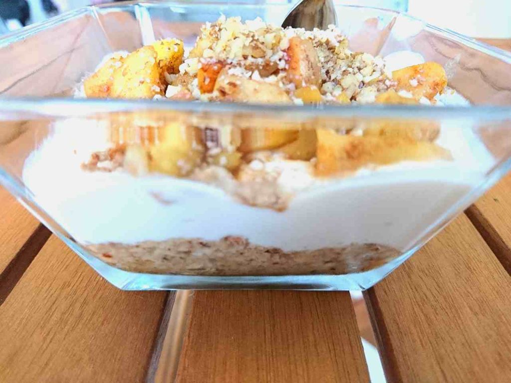 Pridáme ku nim trochu medu a škorice. Pripravíme si 2 misky/poháre na dezert a na spodok natlačíme orechovo-sušienkovú zmes.