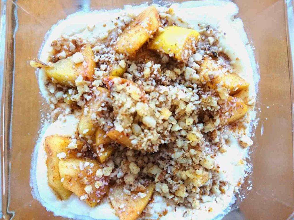 Hotové jabĺčka pridáme na tvaroh ako poslednú vrstvu a dozdobíme mletými orieškami.