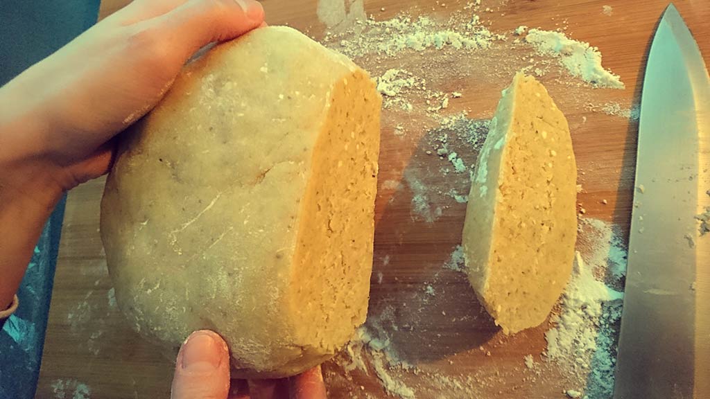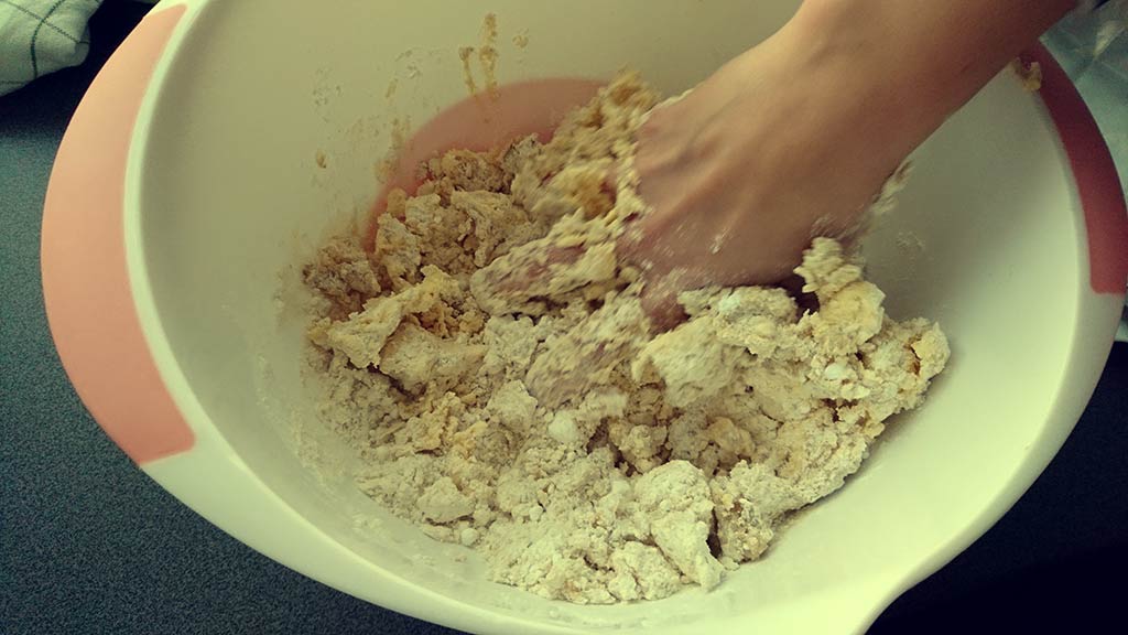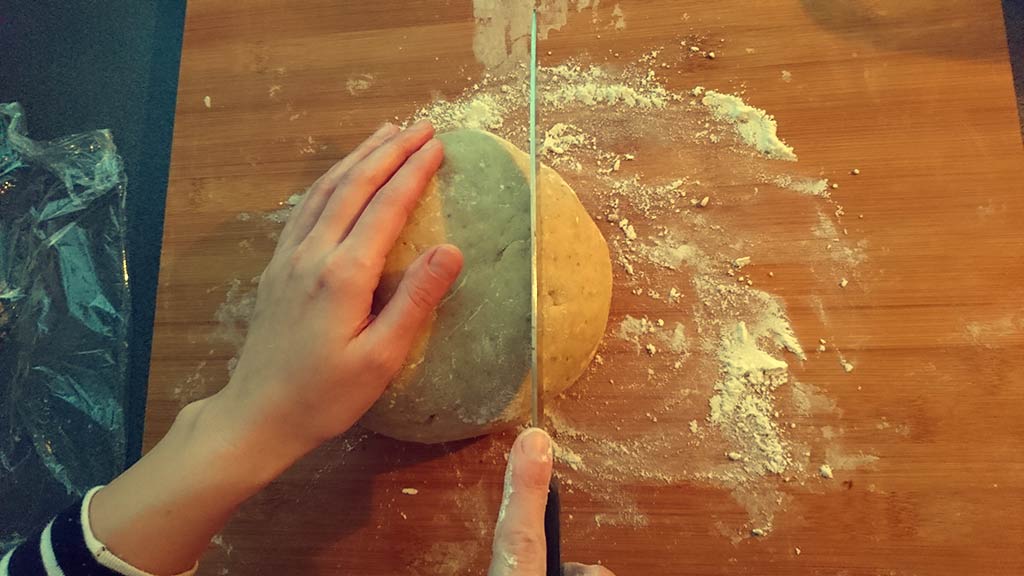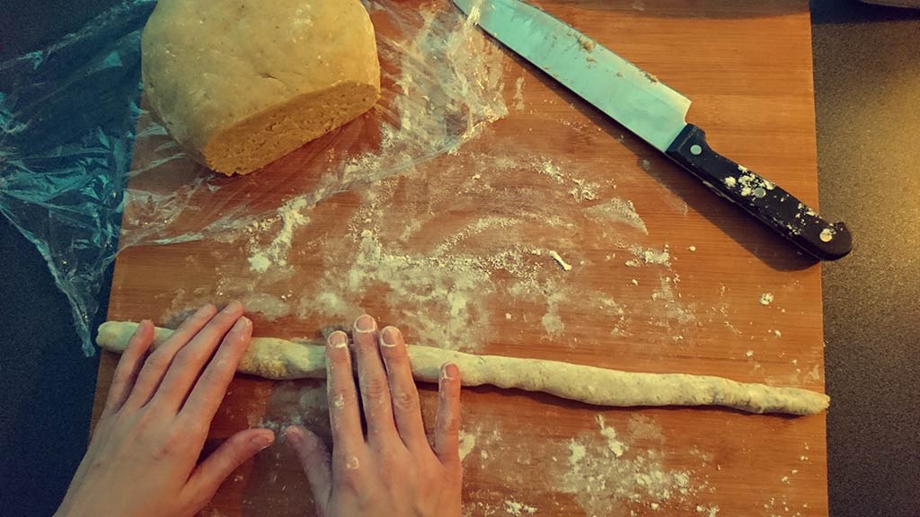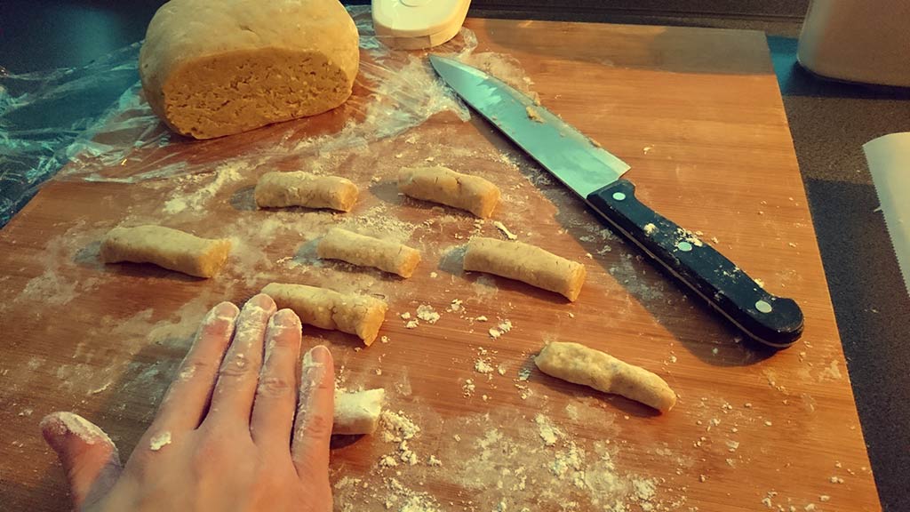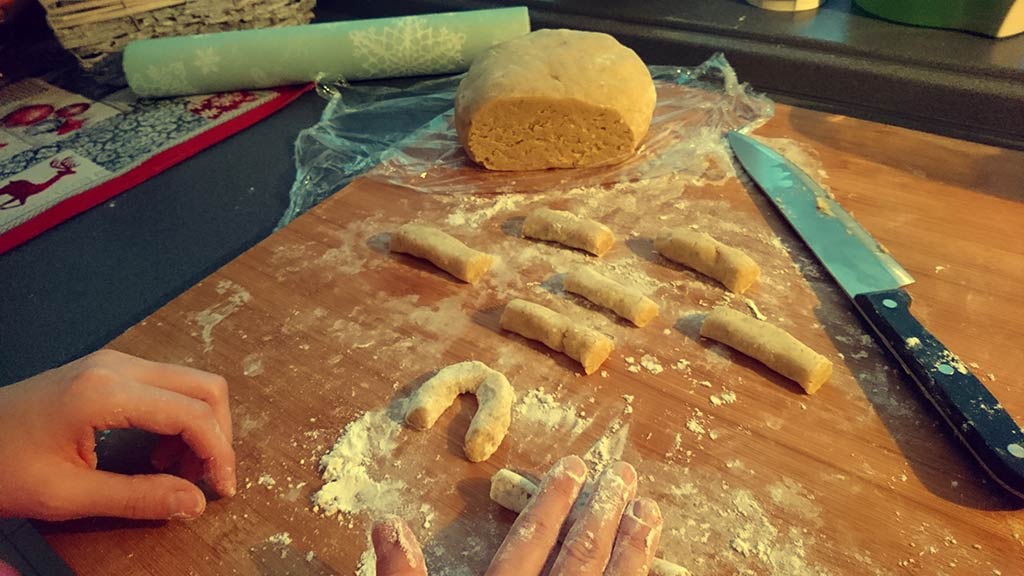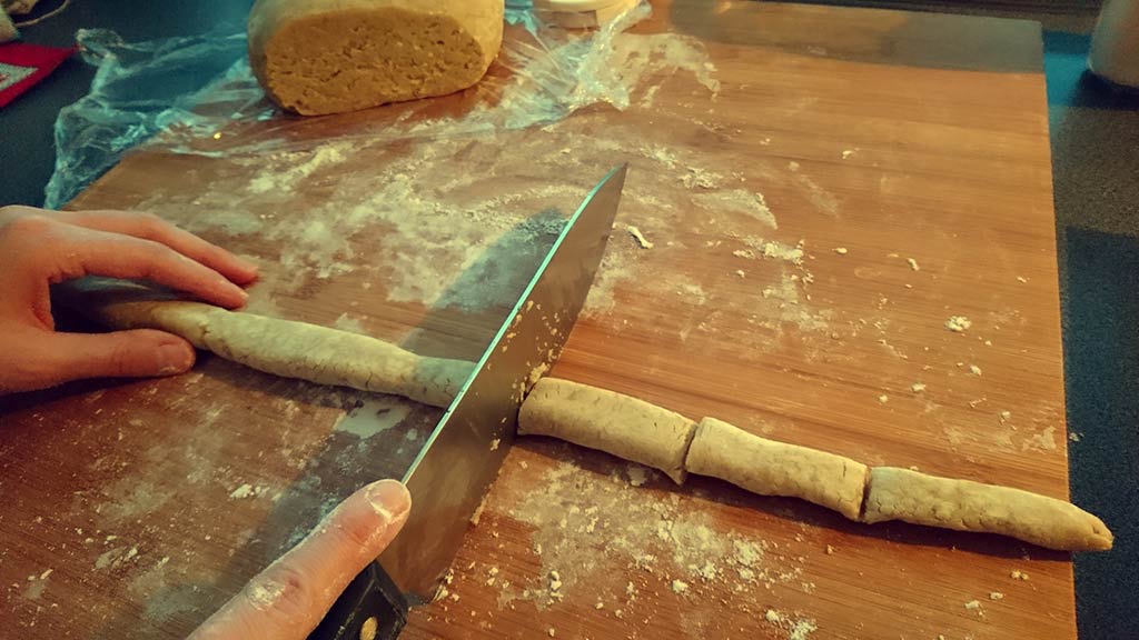 Odležané cesto si rozdelíme na približne 6-8 rovnakých častí. My sme si z cesta postupne krájali pásiky. Z týchto časti alebo pásikov vytvarujeme šúľok hrubý asi ako malíček a nakrájame na menšie dieliky. V tomto bode už ostáva naozaj len na vás, či sa rozhodnete pre menšie alebo trošku väčšie dieliky. Každý z nich zatočíme do tvaru rožteka. Niektoré gazdinky zvyknú používať aj formičky, čo samotný proces urýchľuje, ale my sme sa rozhodli tvarovať – aj menšie, aj väčšie rožteky 🙂