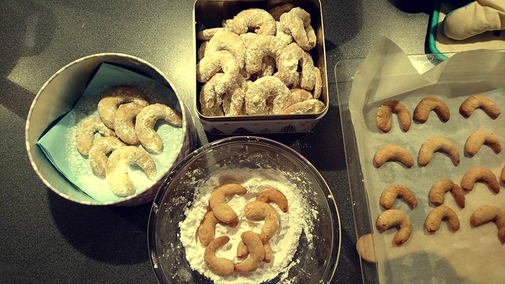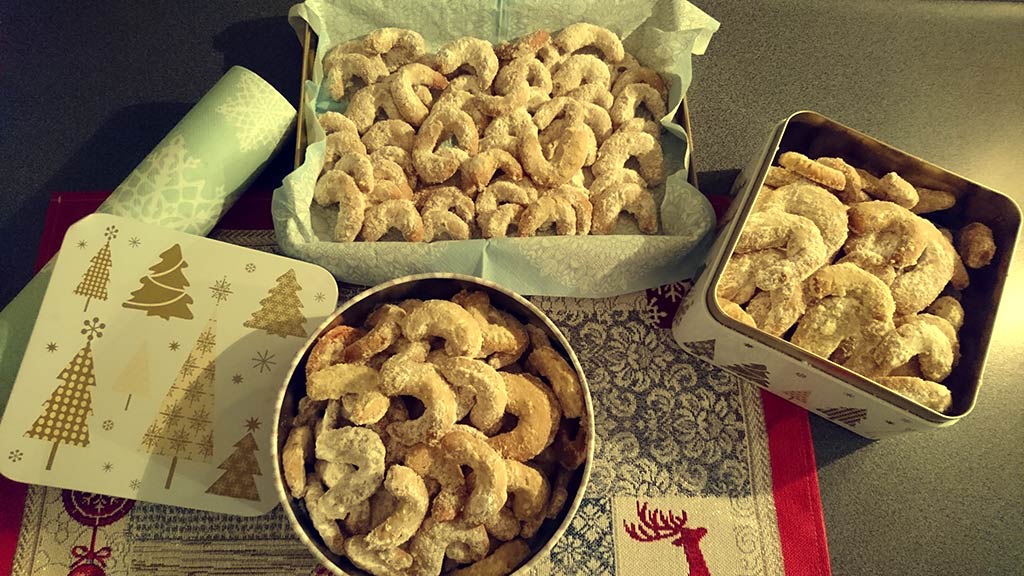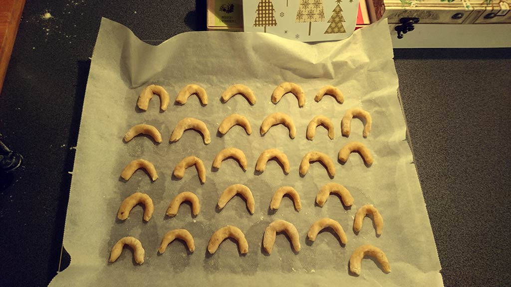 Ešte horúce opatrne obaľujeme v zmesi práškového a vanilínového cukru. A už sa môžeme tešiť na lahodnú vianočnú pochutinku 🙂