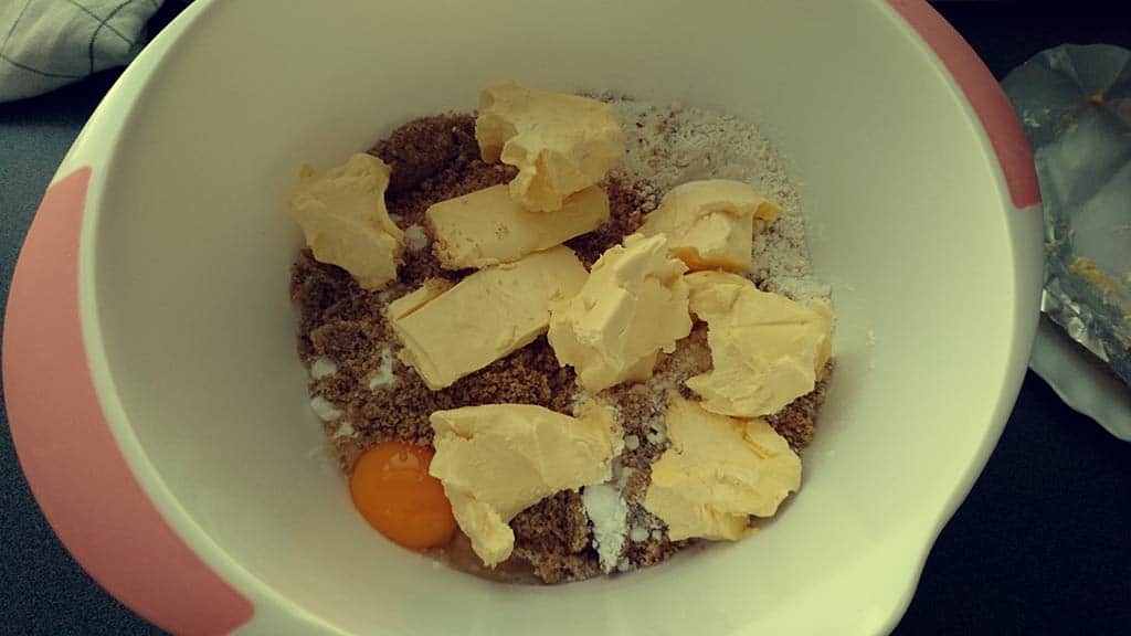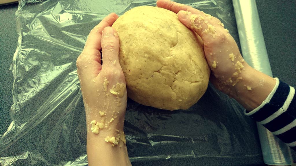 Najskôr odporúčame nechať zmäknúť heru či maslo. Je však oveľa lepšie použiť maslo, nakoľko sa s ním lepšie pracuje a zároveň je aj chutnejšie. Následne po zmäknutí si z múky, práškového cukru, orechov, hery/masla, vajíčka a kypriaceho prášku vypracujeme cesto. Cesto bude trochu krehké, ale ak ho budeme spracovávať rýchlo a nestihne sa v rukách príliš zohriať, bude sa nám s ním lepšie pracovať. Vypracované cesto zabalíme do potravinovej fólie, prípadne alobalu a necháme odpočívať v chlade minimálne 2 hodiny. S takýmto odležaným cestom sa všeobecne pracuje lepšie.